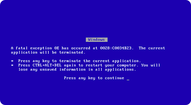 Fast forward to the mid-90’s. The Windows 95 operating system takes off with widespread acceptance. Along with the attractive new look and feel though, comes something ugly, sinister, and blue—the dreaded “Blue Screen of Death” (BSOD). The BSOD raises its head when Widows encounters an unrecoverable error, which seems to occur entirely too often.