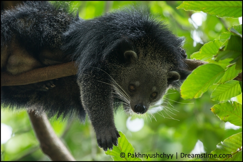 In the hot, steamy jungles of Southeast Asia, lives a most wonderful creature. 1 It’s about the size of a dog, dark gray to black in color, and dines primarily on fruit. 1 With the face of a cat and the body of a tiny bear, the furry little guy is often described as “adorable.” 2 The common name for this unusual animal is bearcat, but the proper name for it is binturong (bin’-tuh-wrong). 1,2